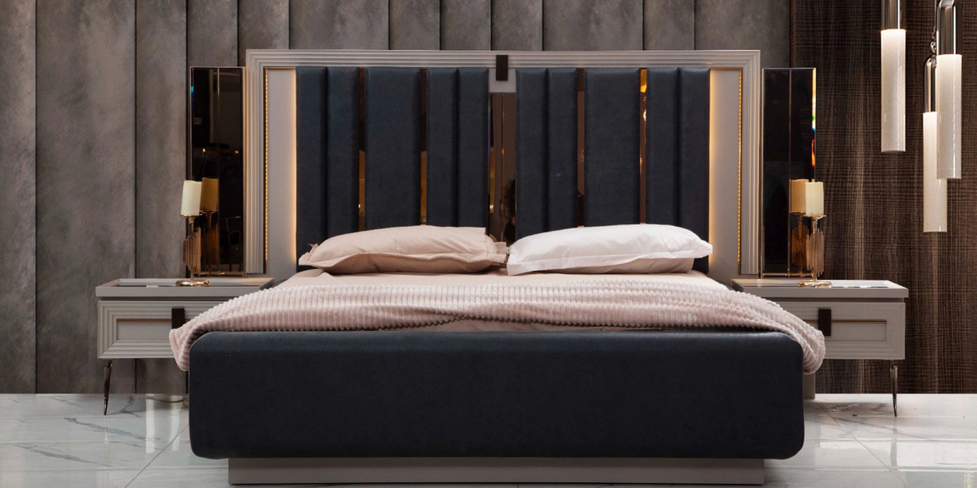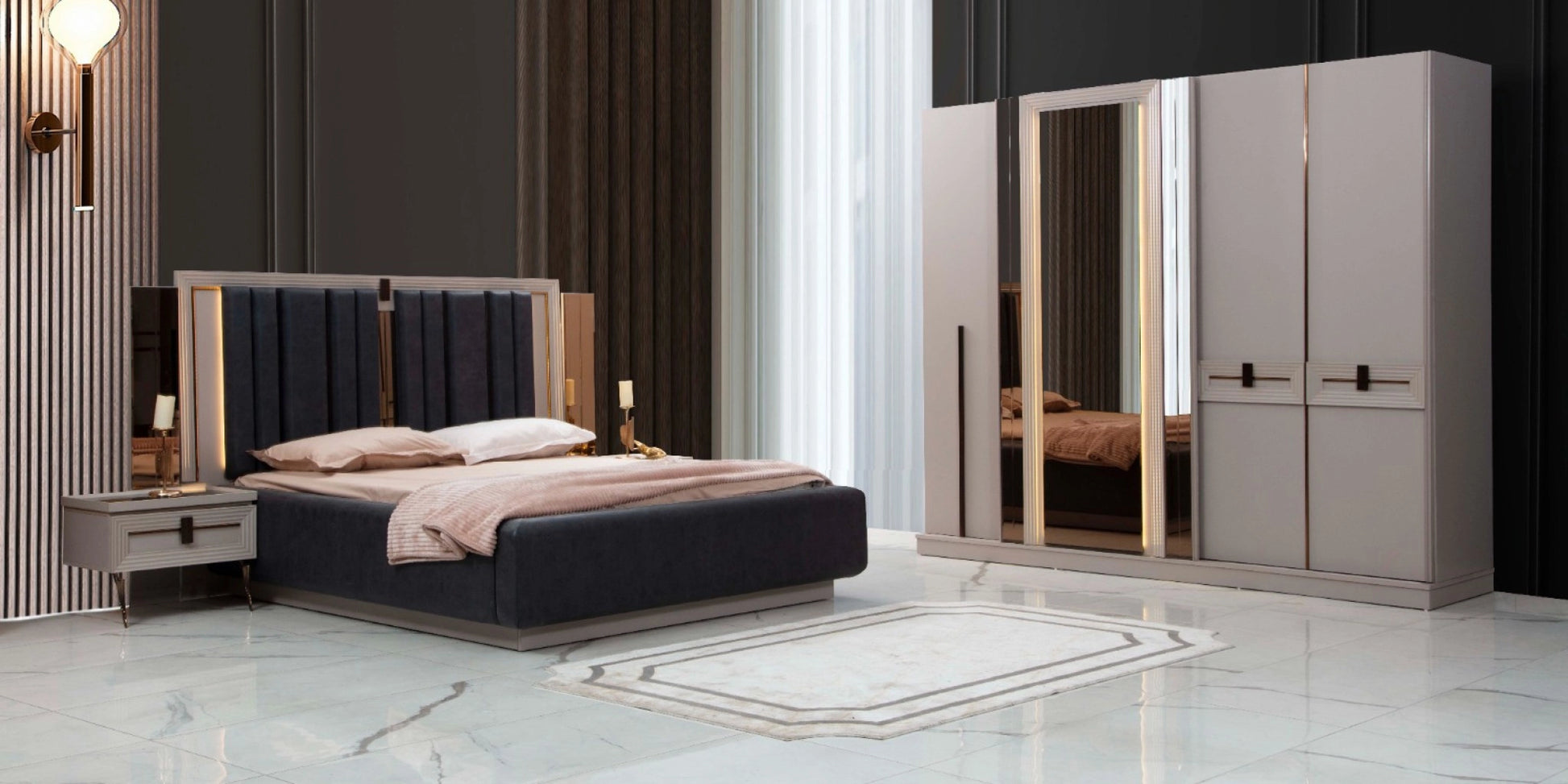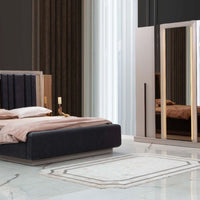 Unser stilvolles Evelyn Designer Schlafzimmer-Set vereint moderne Eleganz und hochwertige Handwerkskunst und bietet luxuriösen Komfort in jedem Detail. Die sorgfältige Verarbeitung und die edlen Materialien verleihen Ihrem Raum eine elegante und stilvolle Atmosphäre, während die praktischen Elemente eine optimale Nutzung ermöglichen.